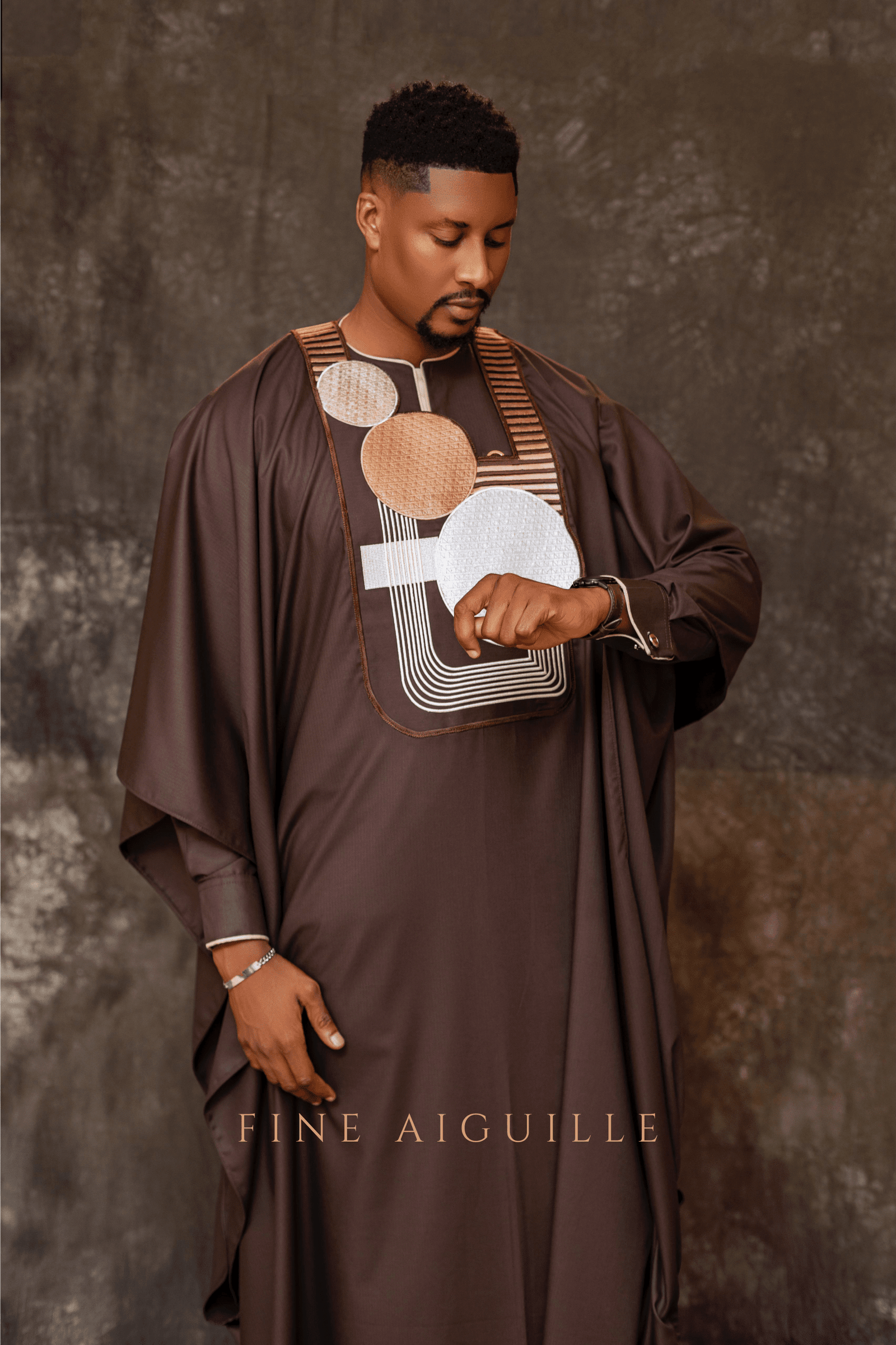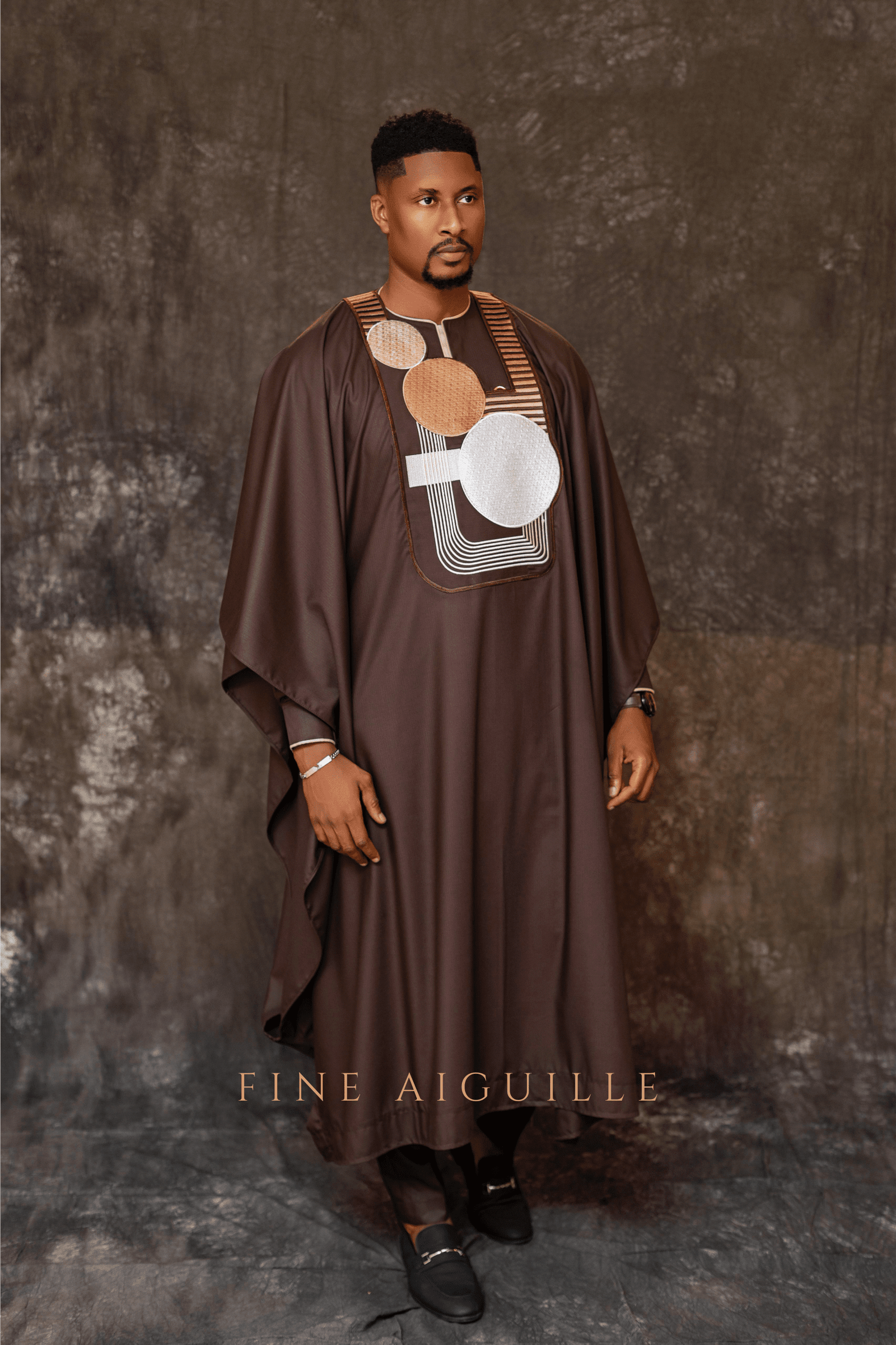 Agbada 3 pièces en coton premium chocolat, broderie contemporaine exclusive aux motifs géométriques avant-gardistes.