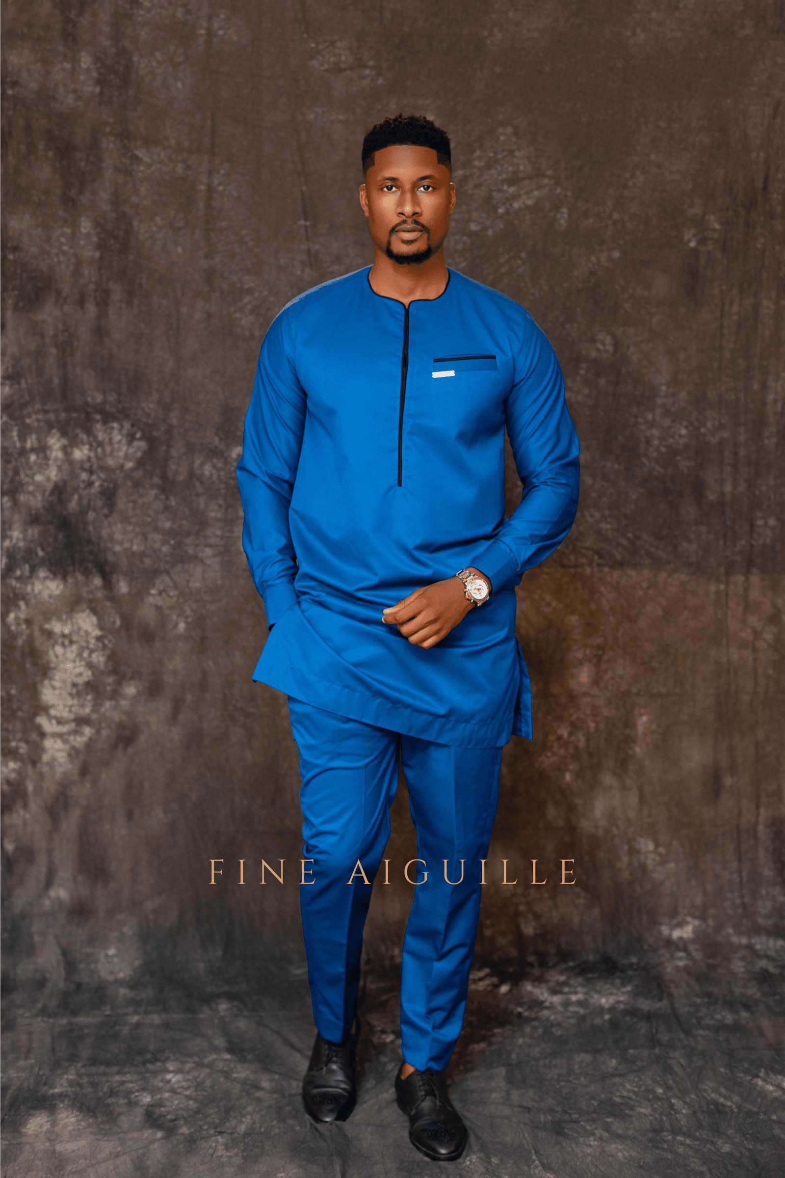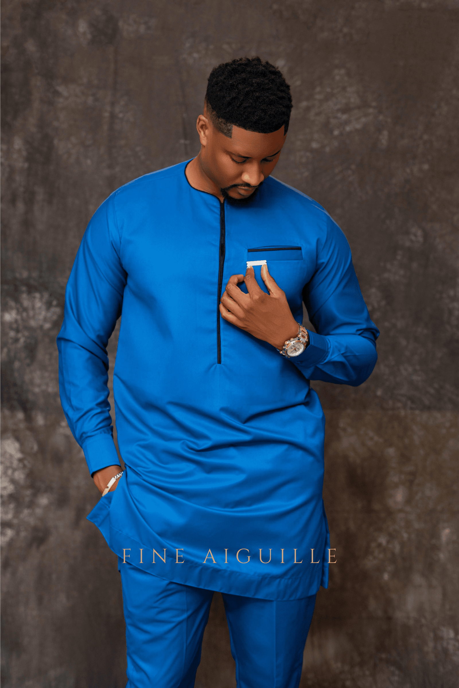 Kaftan mi-long en coton premium bleu royal éclatant, finitions noires exclusives aux détails raffinés. Un hommage au prénom Cheikhou, symbole de sagesse, de distinction et de guidance spirituelle dans la tradition africaine.