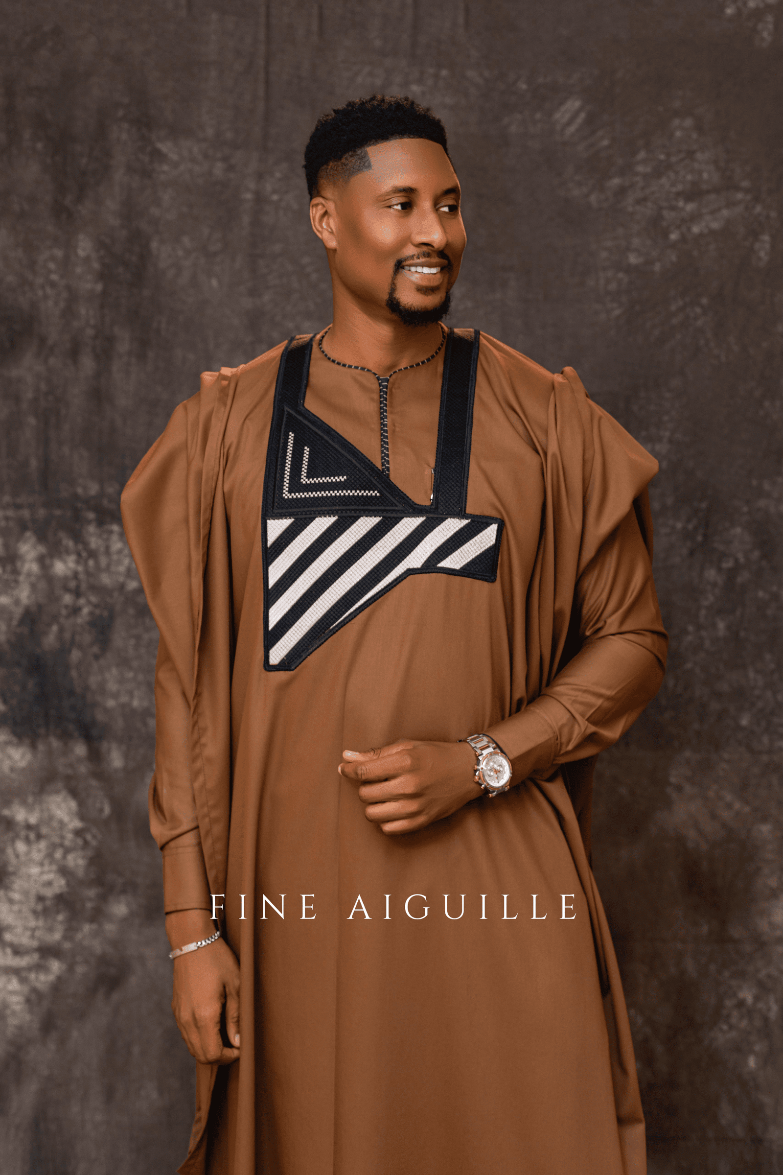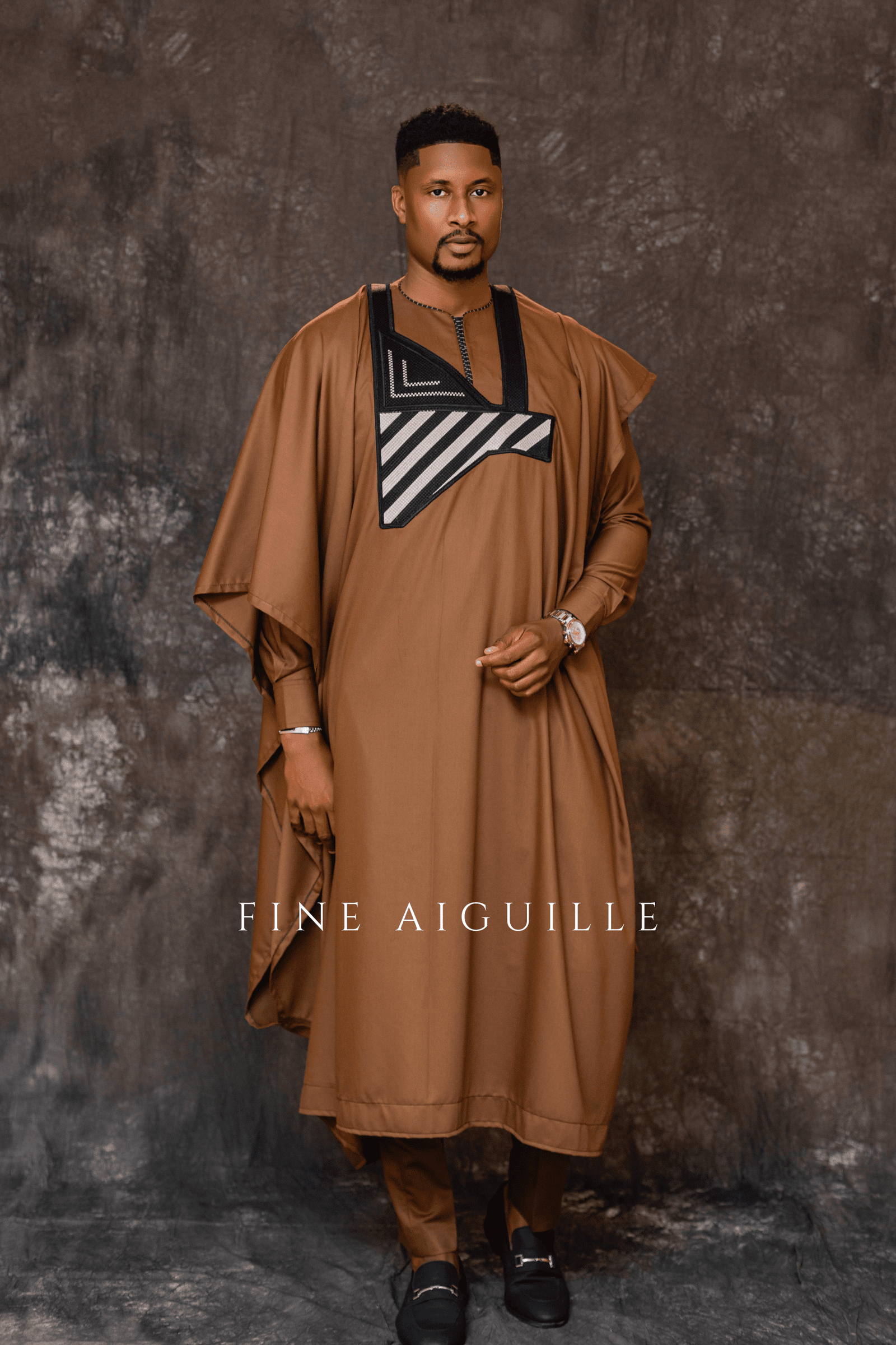 Agbada 3 pièces en coton premium marron camel, broderie géométrique